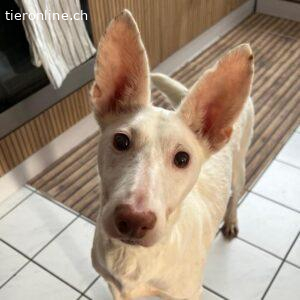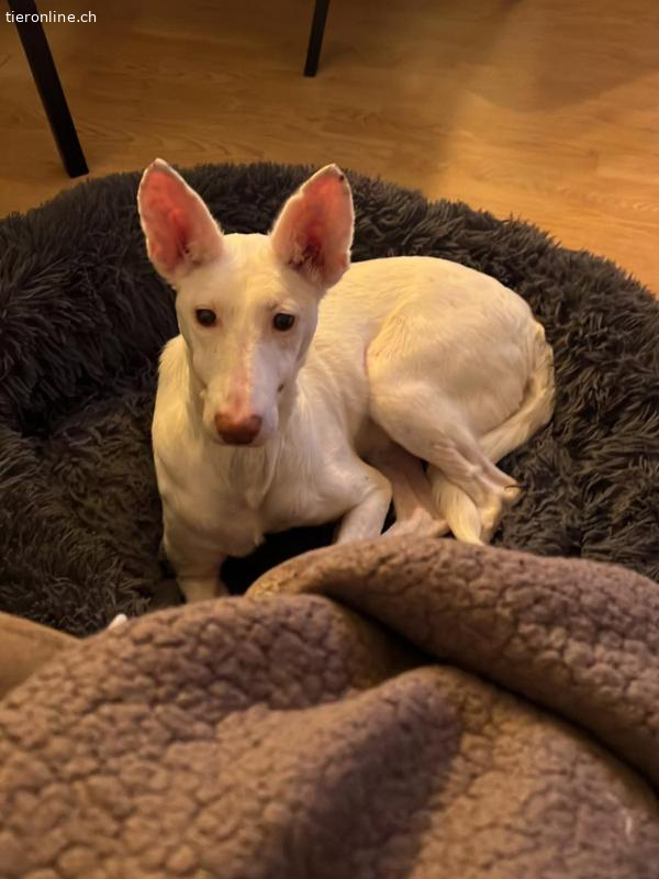 So richtig weiß die süße Susona noch nicht, was sie von dem kleinen Stoffelch halten soll. Also erst einmal vorsichtig beschnüffeln, vielleicht ist es ja ein neuer Freund? Auf den Fotos wird sehr deutlich, was diese liebe, schneeweiße Podenca besonders mag: auf einem weichen Sofa kuscheln. Wer bereits diese besondere Rasse kennt, weiß, dass ein kuscheliges Plätzchen das größte Glück für jeden Podenco ist, vorausgesetzt natürlich er bzw. sie hat ein schönes Zuhause. Für Susona hoffen wir, dieses neue, schöne Zuhause zu finden. Beim Fotoshooting zeigt sie sehr freundlich-selbstbewusst, was für ein besonderer Schatz sie ist. Mit ihren großen Ohren wird ihr absolut nichts entgehen. Typisch Podenco ist sie intelligent, sehr feinfühlig, aufmerksam und neugierig. Diese Rasse wurde für die Jagd gezüchtet, um z.B. Kaninchen aufzustöbern und dem Jäger lebend zu bringen. Sie jagen mit allen Sinnen und sind niemals aggressiv. Sie brauchen die Gesellschaft von Menschen und sehr gerne auch die von anderen Hunden. So ist es auch bei Susona. Ob sie jemals gejagt hat, ist nicht bekannt.