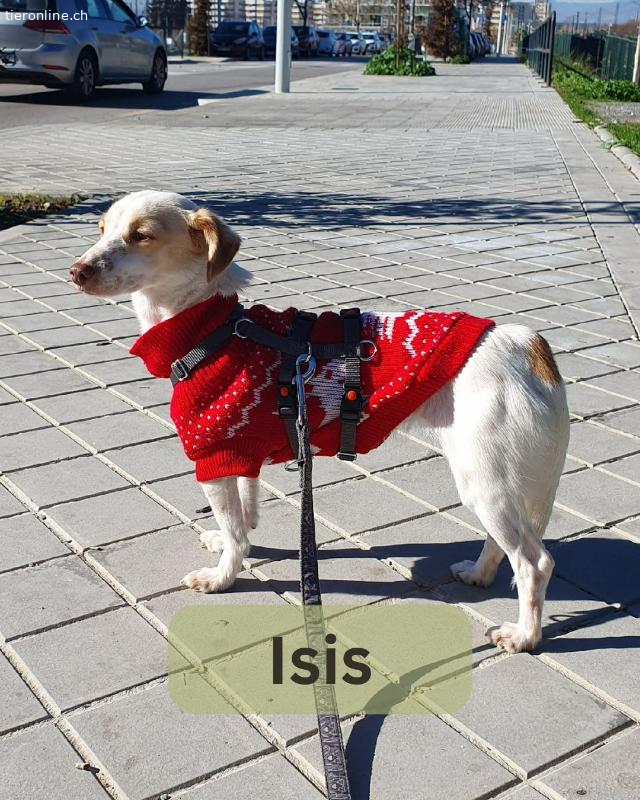 Isis wurde alleine in einem Dorf gefunden, ohne Chip, als sie sich von einem toten Tier ernährte. Sie war sehr abgemagert (nur ca. 4 kg), hatte eine Wunde am Hals und litt an Gastroenteritis. Nach tierärztlicher Behandlung ist sie heute gesund, die Tests auf Mittelmeerkrankheiten sind negativ.