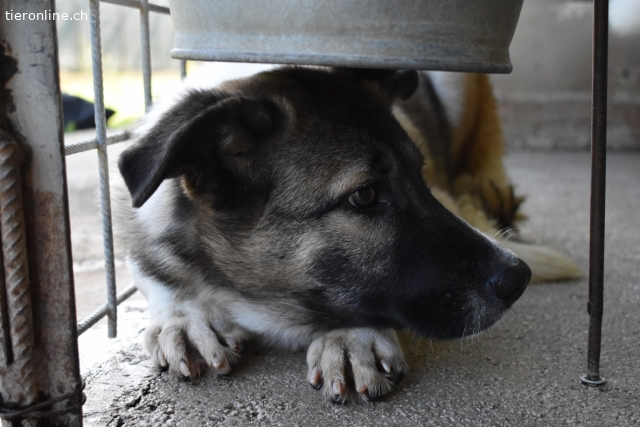 Unsere zwei Hundekinder scheinen bislang noch nicht sehr viele Begegnungen mit freundlichen Zweibeinern gehabt zu haben. Beim Besuch der mit uns befreundeten Tierschützer Anfang November 2025 zeigten sich beide schüchtern, vielleicht sogar ein wenig ängstlich. Es sind keine Angsthunde, aber sie kennen Berührungen, die Leine oder einfach nur die Gegenwart von Menschen, die es gut mit ihnen meinen, nicht. Aber weder Quorivah noch Quarven haben Aggressivität gezeigt, weder die eine noch der andere hat zum Beispiel bei Berührung zu schnappen versucht, wie das einige Hunde aus Angst oder Unsicherheit tun. Nein, Quorivah und ihr Bruder haben Fluchtwege gesucht, sind unter den Trinkeimer gekrochen oder haben sich hinter einem ihrer Zellengenossen versteckt.