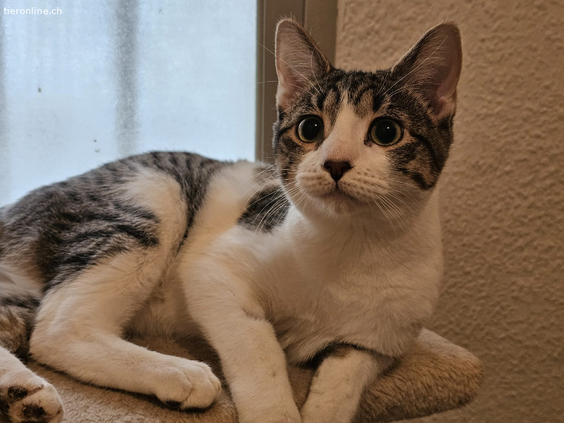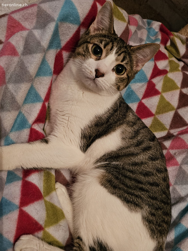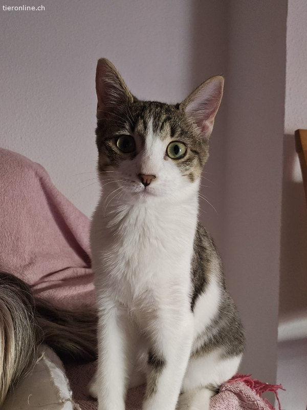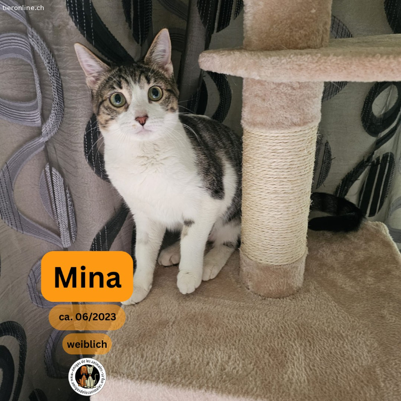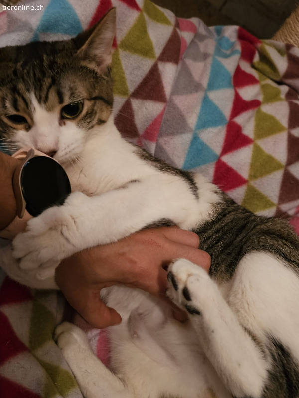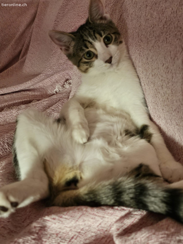 Mina ist ein schüchternes Kätzchen, aber sehr lieb. Sie liebt es, auf dem Bauch gestreichelt zu werden. Sobald sie deine Hand spürt, legt sie sich auf den Boden und lässt sich von dir streicheln. Sie mag es, in den Armen gehalten zu werden und den Kontakt zu suchen. Sie liebt Kratzbäume und Spielzeug.